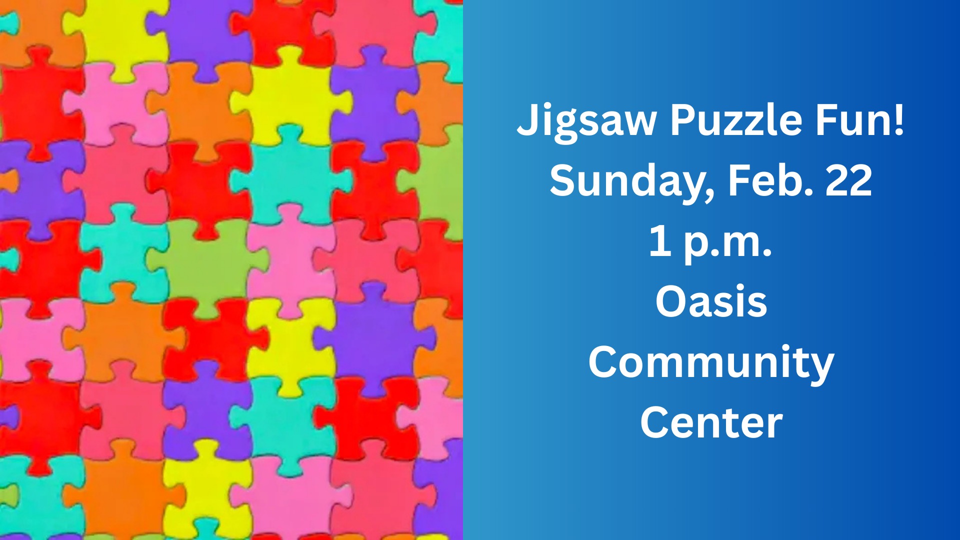 Bring a snack to share and join fellow Oasians for some jigsaw puzzling! Puzzles will be provided.