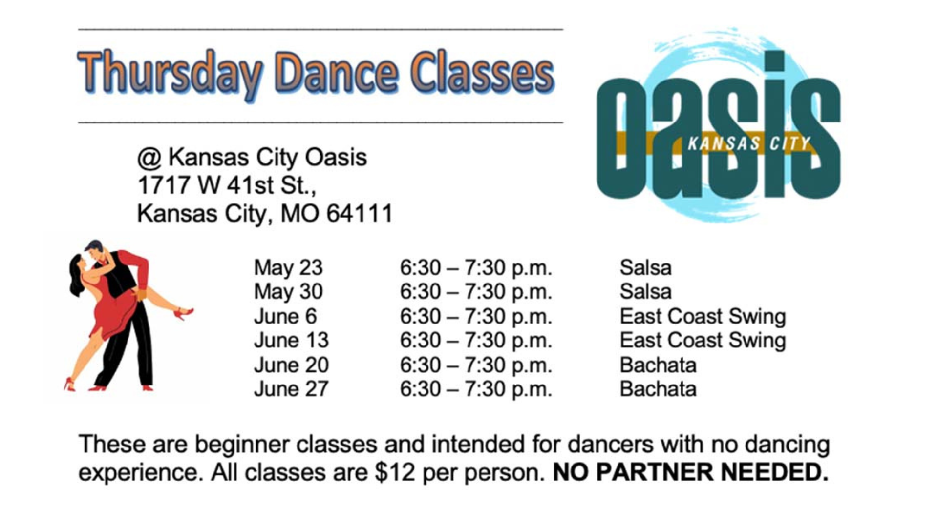 They’re here — Oasis dance classes! Thursday nights at 6:30, $12/class. No experience or partner needed!